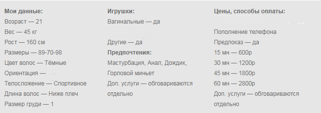 Девочка просто сказка. Супер фигурка. Услуги все есть. Дырочки отличные сосет горловой минет. Трахается во все дырки. Делает всё что скажешь. Отличное сексуальное белье. Есть золотой дождь. Вобщем она лучшая из всех которые здесь есть! Честно отрабатывает очень позитивная.
