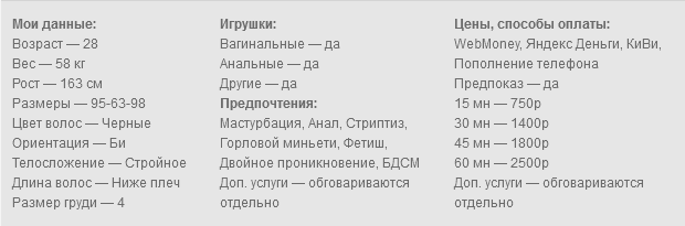 В привате общение, стриптиз, ласки, дразнение, миньетик, горловой миньетик, киса, попа, пальчики, игрушки, двойное проникновение, фетиш ( фут-фетиш,лёд,слюнки ), бдсм (Госпожа — ласковая или строгая, доминация, подчинение, унижения, насмешки, маты, приказы, куколд, контроль мастурбации) ролевые и другое.
