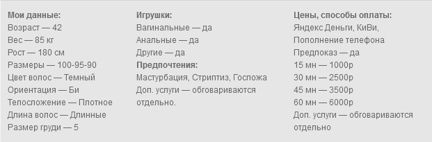 Всем кому нравятся зрелые. Красивые ухоженные, опытные женщины, с умением импровизации, на ваши сексуальные фантазии вы попали именно к той женщине. Грудь твердая четверка, ноги от коренного зуба, попка как орех, с чувством юмора. Умением поднять вам настроение и не только. Ролевые игры, миньетик, вообщем все и все остальное. Была на выставке собак, приз на лучшую сучку достался мне.