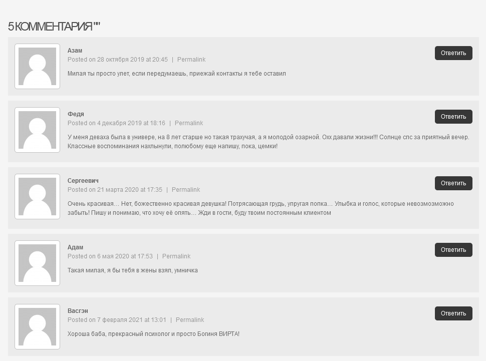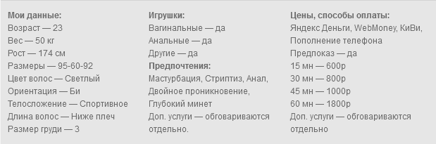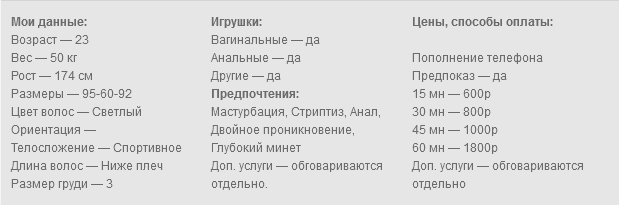 Я молодая и очень похотливая девушка которая очень возбуждается даже от самой мысли о сексе по камере. В вирте со мной ты сможешь увидеть, как я нежно ласкаю свою упругую грудь, провожу своим язычком по своим сосочкам, что меня очень заводит. Ласкаю писечку пальчиками и игрушечками одной большой второй поменьше. Так же могу поласкать свою попочку и сделать минет игрушке. И многое другое, заходи ко мне на жаркий виртик. Остальное пишите не стесняйтесь, все обсудим договоримся.