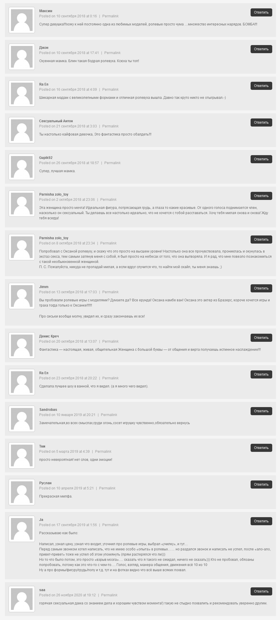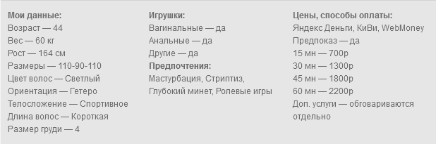 Всем кому нравятся зрелые. Красивые ухоженные, опытные женщины, с умением импровизации, на ваши сексуальные фантазии вы попали именно к той женщине. Грудь твердая четверка, ноги от коренного зуба, попка как орех, с чувством юмора. Умением поднять вам настроение и не только. Ролевые игры, миньетик, вообщем все и все остальное. Была на выставке собак, приз на лучшую сучку достался мне.