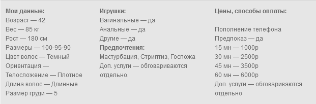 Всем кому нравятся зрелые. Красивые ухоженные, опытные женщины, с умением импровизации, на ваши сексуальные фантазии вы попали именно к той женщине. Грудь твердая четверка, ноги от коренного зуба, попка как орех, с чувством юмора. Умением поднять вам настроение и не только. Ролевые игры, миньетик, вообщем все и все остальное. Была на выставке собак, приз на лучшую сучку достался мне.