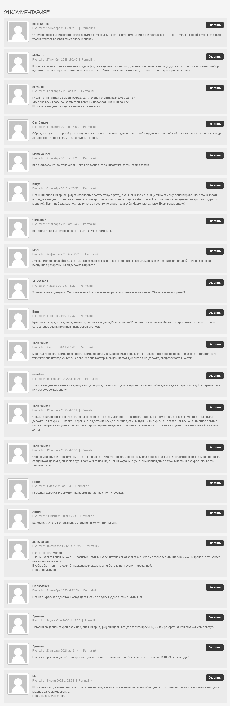 Я очень люблю заниматься виртом, при этом показывать свое молодое и возбуждающее тело которое не оставит вас равнодушным. Благодаря моей качественной камере в вирте будет все хорошо видно и вы сможете наслаждаться каждой частью моего тела. Для вас я станцую возбуждающий стриптиз и полностью разденусь, помастурбирую свою кисочку и поиграю пальчиком с своей попкой которая очень похожая на свежей персик. По вашему желанию и за дополнительную плату могу сделать фото и видео на заказ по вашему сценарию, а дополнительные услуги можем обговорить отдельно во время вирта. У меня всегда есть хороший звук и я люблю общаться в процессе и описывать свои ощущения. Показываюсь исключительно без лица, для удобства одеваю красивую маску. Могу для вас по желанию поматерится грубым матом, поунижать и сделать золотой дожди. Для любителей возможен футфетиш с моими ножками. С нетерпением жду вас, мои сладкие.